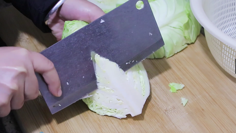 第一步,先把包菜从中间切开,切成四等分,这个时候咱们就能清晰地看到包菜当中的结构了,咱们把包菜梗切掉。