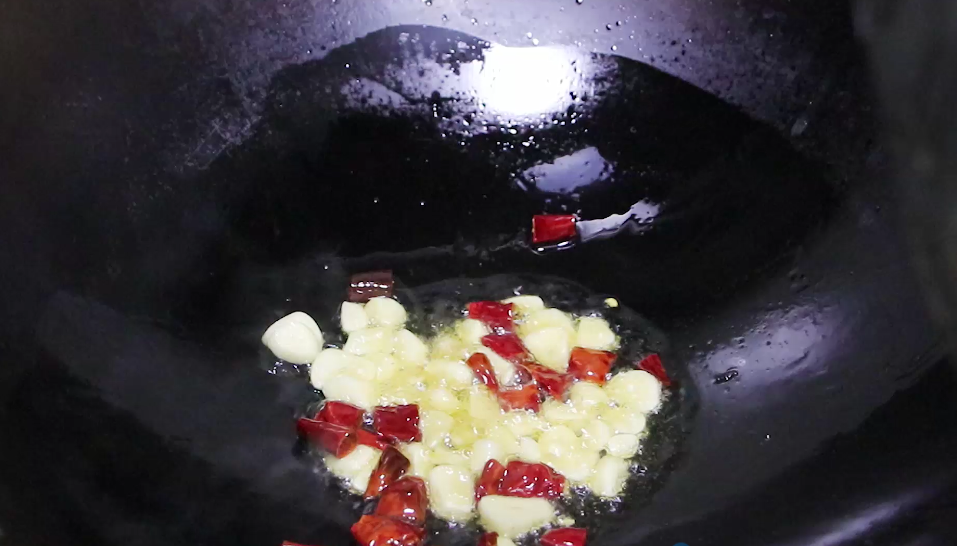 4、让蒜片和干辣椒都均匀的包裹上一层油,后续在炒的时候就不会容易变得焦黄了,这也是饭店大厨教给我的小方法哦。