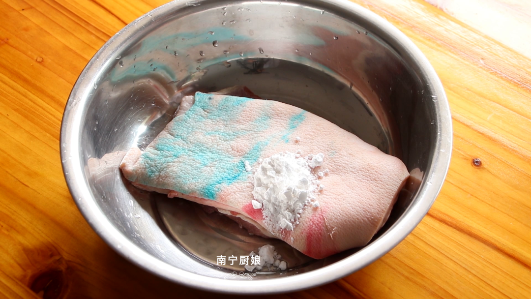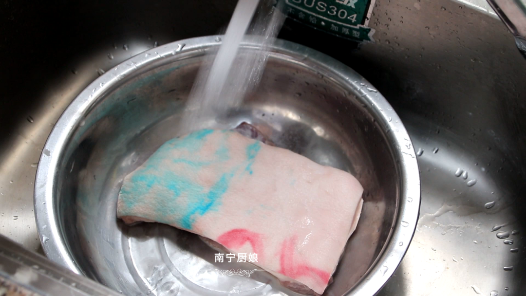 第二步:五花肉都搓洗一遍之后,就可以放在流水下冲洗干净,把残留在猪肉表皮上的面粉液一起冲洗下来。