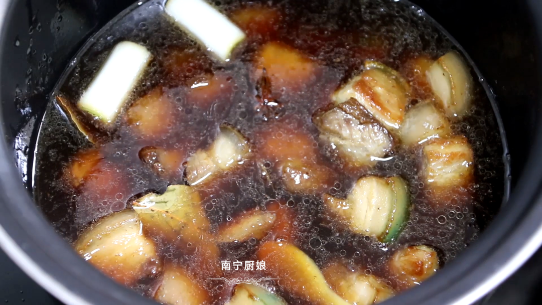 第十一步:时间到之后,咱们的猪肉也就熬得差不多了,这个时候猪肉的上色还是不够的。