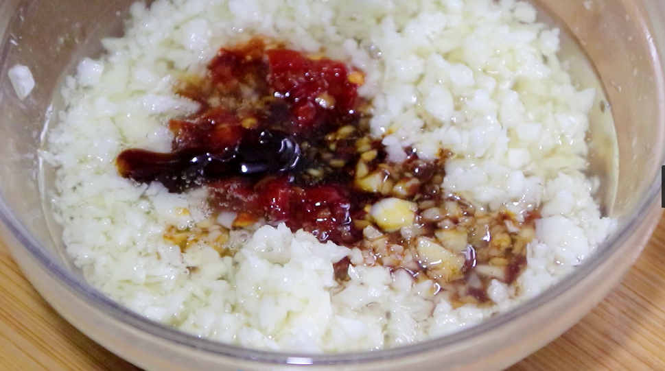 第二步,准备大蒜去皮,然后放进捣蒜器里,打成蒜泥,倒进碗里。这时咱们烧热一些食用油,倒在蒜泥上,激发出蒜泥的香味,再加入适量的生抽、蚝油、白砂糖、清水,调和成酱汁,留着备用。