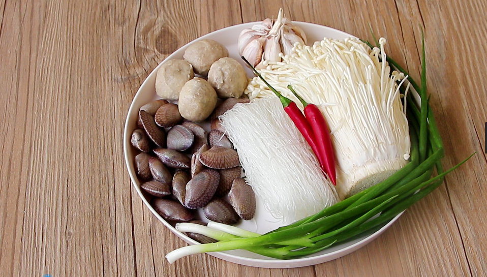准备好食材:花甲螺500克,粉丝200克,金针菇300克,蒜米一颗,牛肉丸适量,小红椒适量,葱花一小把