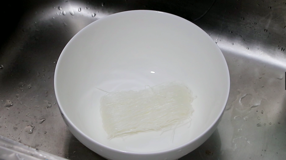 第一步,把粉丝放进一个大碗里,加入多一些的清水,清洗掉粉丝上的灰尘之后,再加入少量的温水,把粉丝泡软。