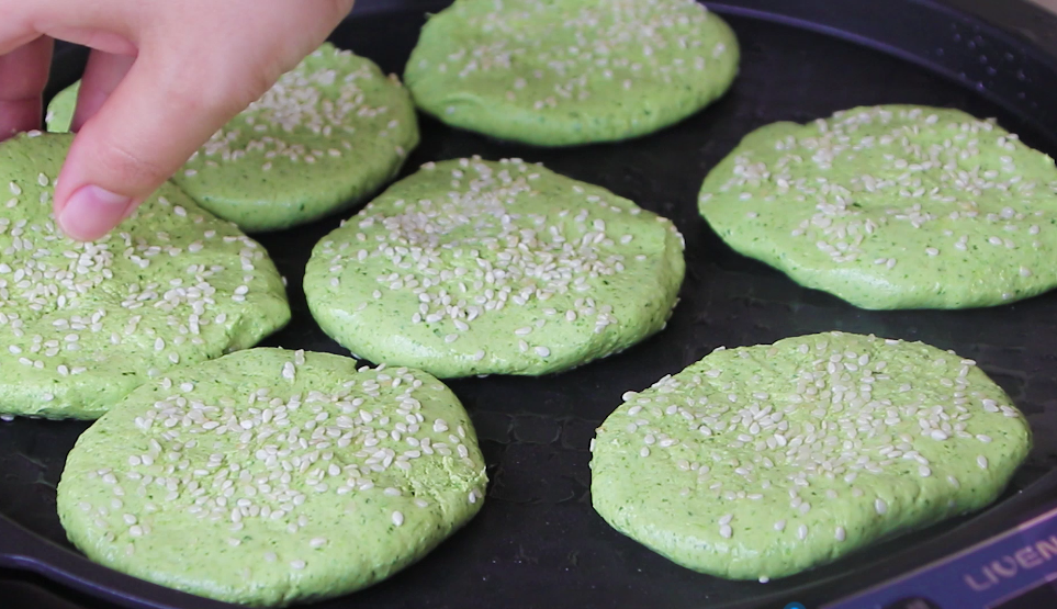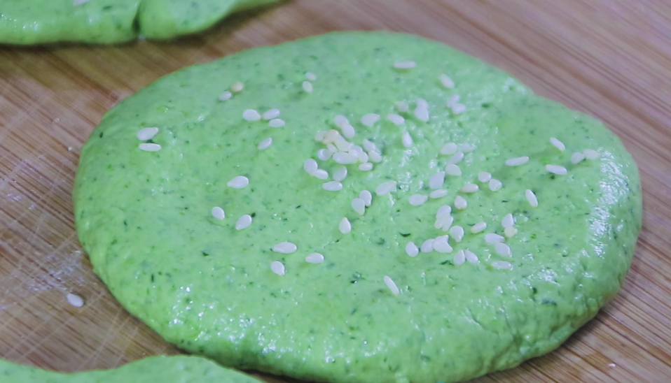 第四步,把面团分成等分的小剂子,手上倒一些食用油,可以起到防粘的效果,这个时候咱们再把面剂子,按压成一个个小圆饼的形状。整理好所有的面饼剂子之后,在面剂子的上方再撒上一些白芝麻,咱们的茼蒿饼胚子就做好了。
