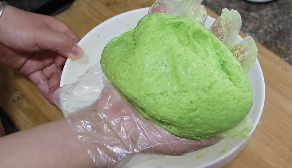 第三步,把茼蒿泥放进一个大一些的碗里,少量多次地加入糯米粉和白糖,把茼蒿菜和糯米粉搅拌成一个大一些的面团,喜欢吃硬一些口感的小伙伴可以把面团调干一些,喜欢软一些的就调稀一些。