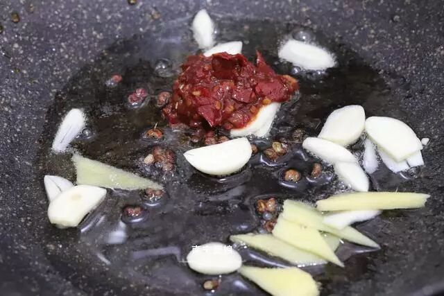 2、锅中烧油,放入蒜,姜,花椒,豆瓣酱一起爆香。2、锅中烧油,放入蒜,姜,花椒,豆瓣酱一起爆香。