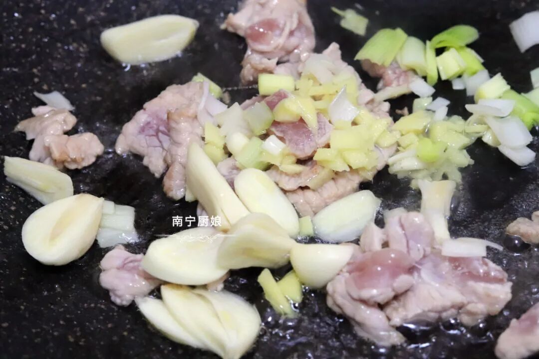 4、在锅里烧热油,把里脊肉块倒进去翻炒变色,然后把葱姜蒜倒进去一起炒香。