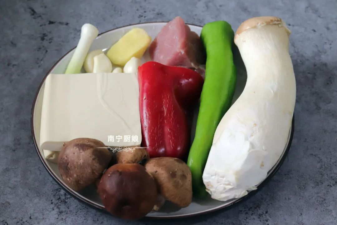 准备好食材:水豆腐1块、杏鲍菇1根、青红椒各一颗、里脊肉150克、大葱白1段、生姜1块、大蒜4粒、豆瓣酱1勺、蚝油1勺、生抽半勺、老抽小半勺、食盐1勺、水淀粉半勺、白糖一小勺、鸡粉小半勺、十三香1克。