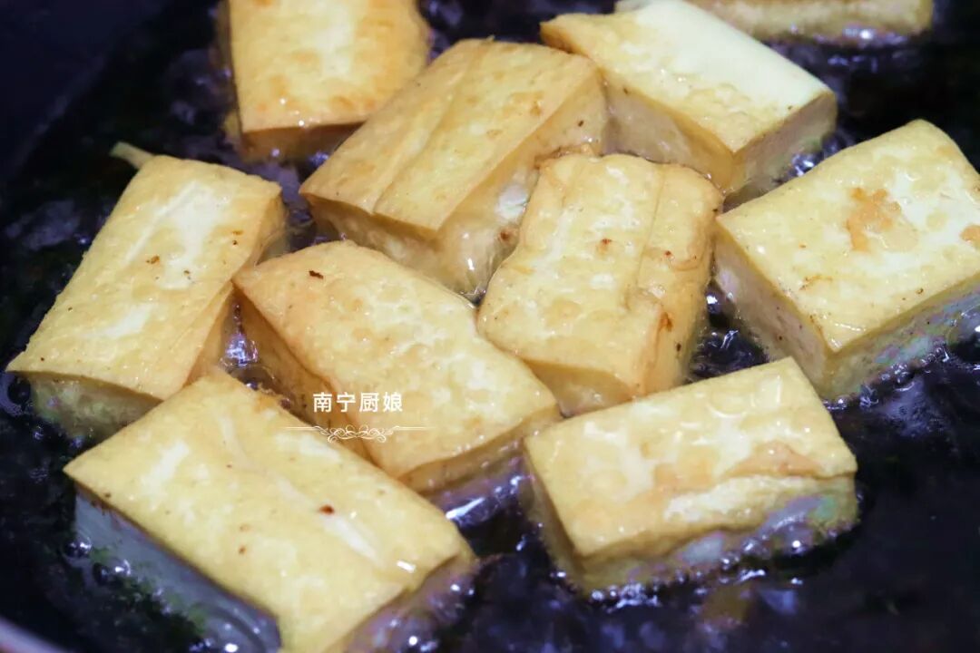 3、在锅里烧热油,把豆腐块倒进去煎炸至表面金黄捞出沥干油待用。