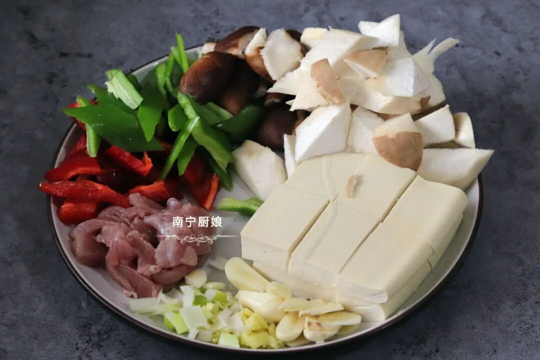 1、把豆腐切成小方块,杏鲍菇切成块、里脊肉切片、青红椒切菱形、香菇切块、大葱白切段、大蒜去皮切块。