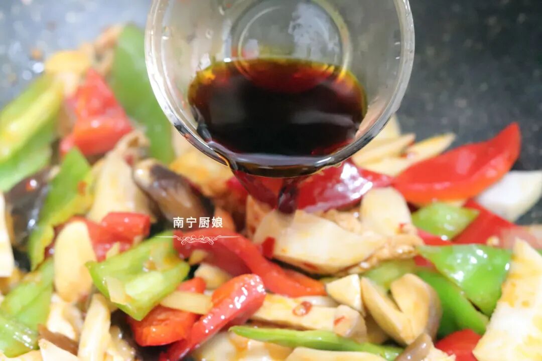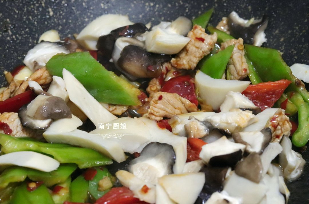 7、把香菇和杏鲍菇块倒进去一起翻炒均匀。