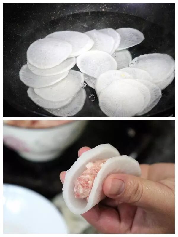 2,切白萝卜的时候,厚度一定要掌握好,太厚了就包不了肉馅了,只能炖羊肉。刀工不好的朋友,可以借助削片工具,但注意也不要削得太薄,太薄在包肉馅的时候萝卜容易破掉。
