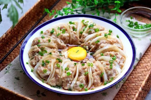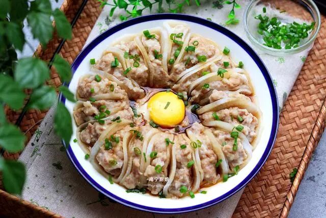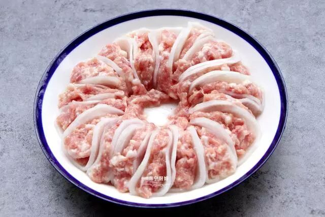 3,将肉馅包入焯好水的白萝卜片,放入盘中,沿盘沿依次摆好,最中间留一个空位给鸡蛋。注意肉馅不要包得太多,不容易熟。