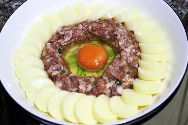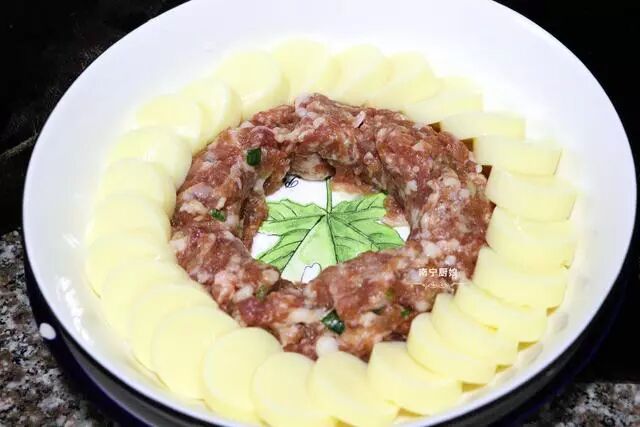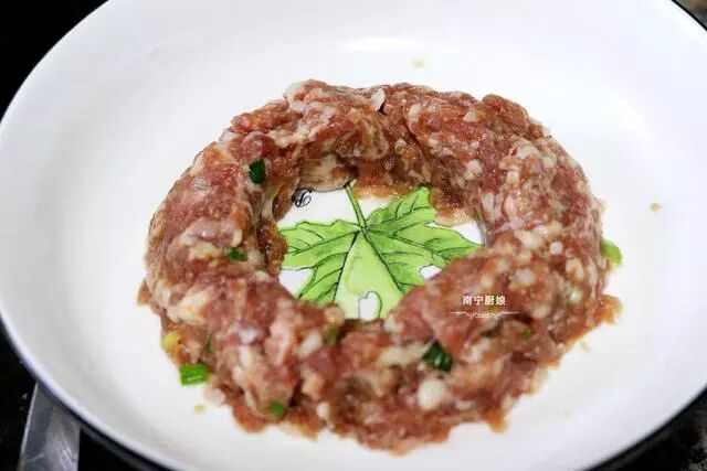 2,将腌制好的肉末放入大一点的瓷盘内,围成一个空心的圆,像甜甜圈一样。