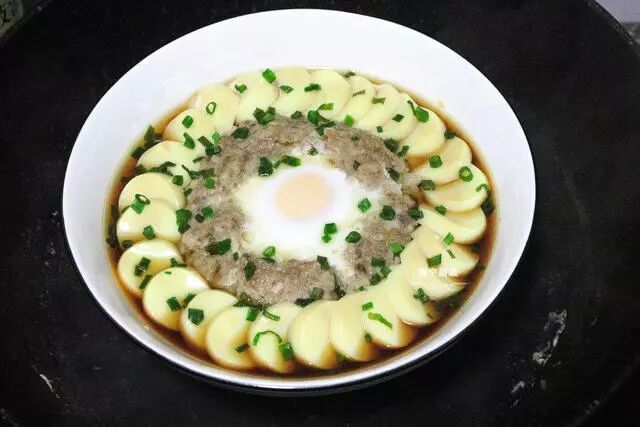 这道菜由鸡蛋豆腐围绕着肉末鸡蛋一圈组成,象征着家人们忙碌了一年,除夕夜这天,大家都围坐在圆桌前一起阖家欢乐品尝美食。这道菜因为是蒸菜,所以特别适合小孩、孕妇、老人吃,营养美味还不怕上火。那这道菜叫什么名字呢?隆重推荐今天的主角:鸡蛋豆腐蒸肉末。鸡蛋豆腐蒸肉末