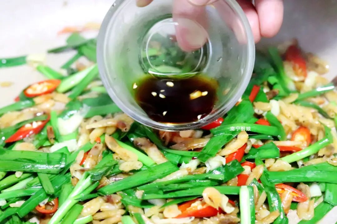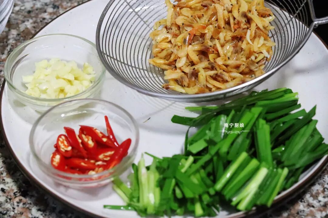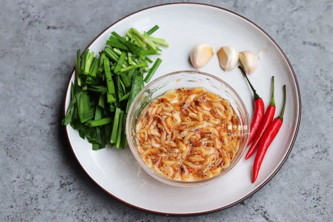 所需食材:韭菜、虾米、小米椒、蒜子、油、盐、生抽