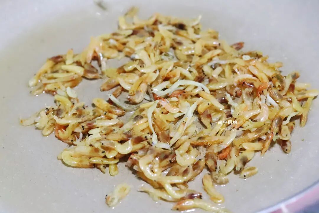 1,在锅中倒入适量的油,待油温升高后,倒入沥干的虾米,中火爆香,这时候虾米的鲜咸味会融入油里。