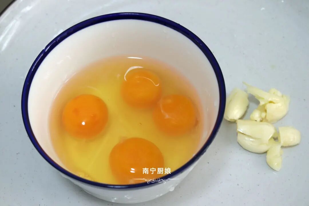 准备好食材:豌豆苗1把、鸡蛋3颗、蒜米3粒、食盐1勺、生抽1小勺。