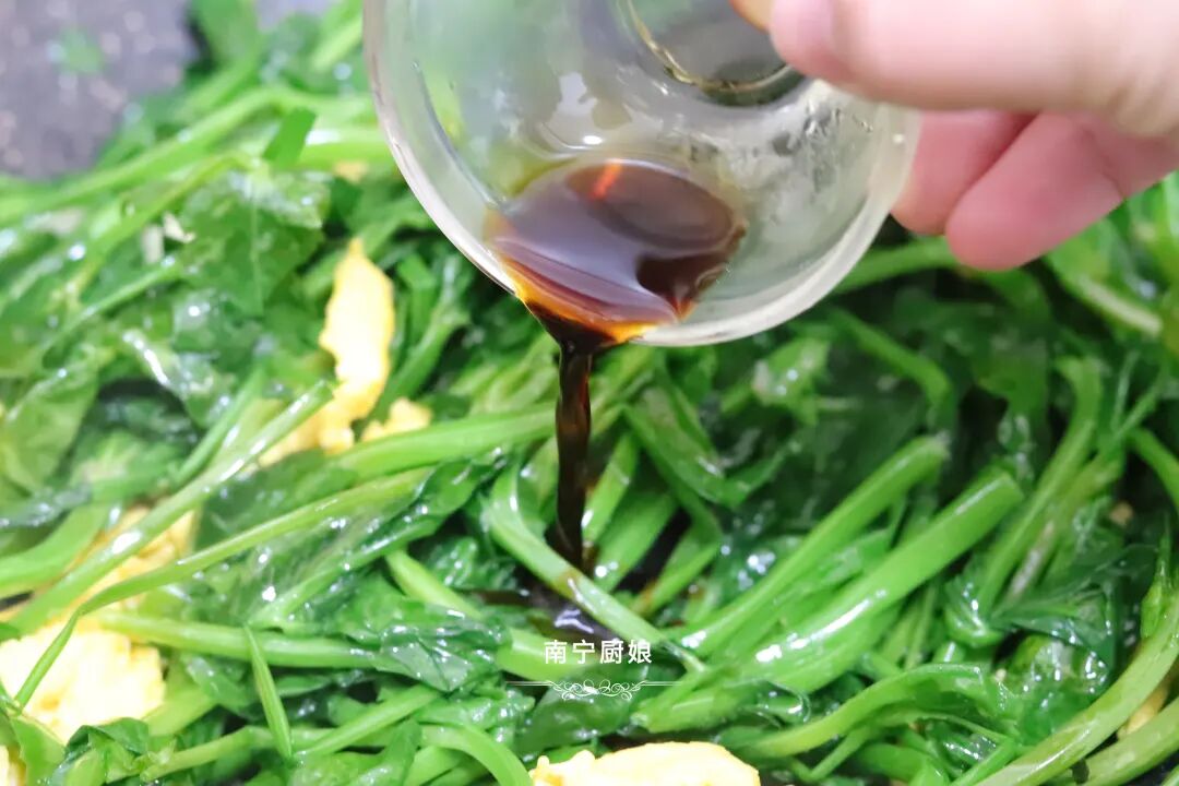 7、出锅之前,放入一小勺生抽和一小勺食盐调味,翻炒均匀即可出锅。