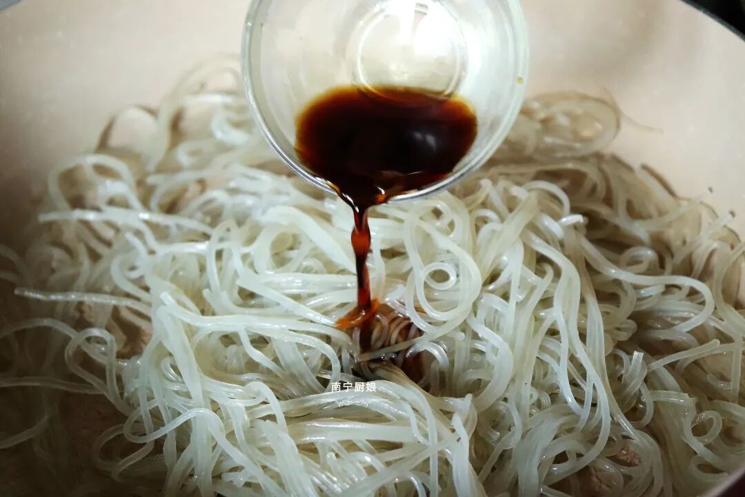 1、起锅小火烧油,倒入泡发好的红薯粉翻炒透,再倒入1滴酱油翻炒均匀上色调味 ,盛出装碗待用。