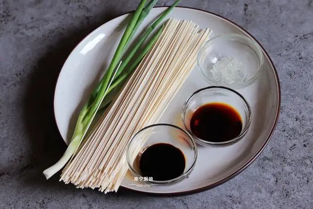 需要准备的食材:细挂面、葱、老抽、生抽、白糖、白胡椒粉、香油。