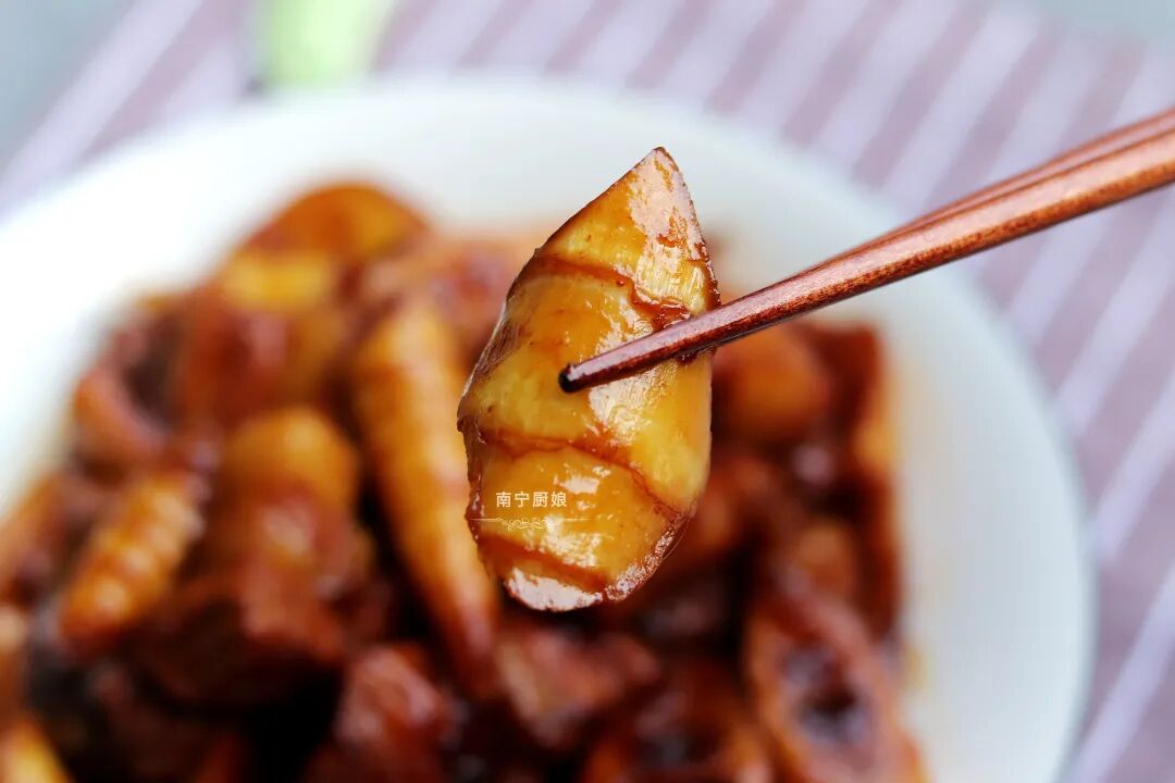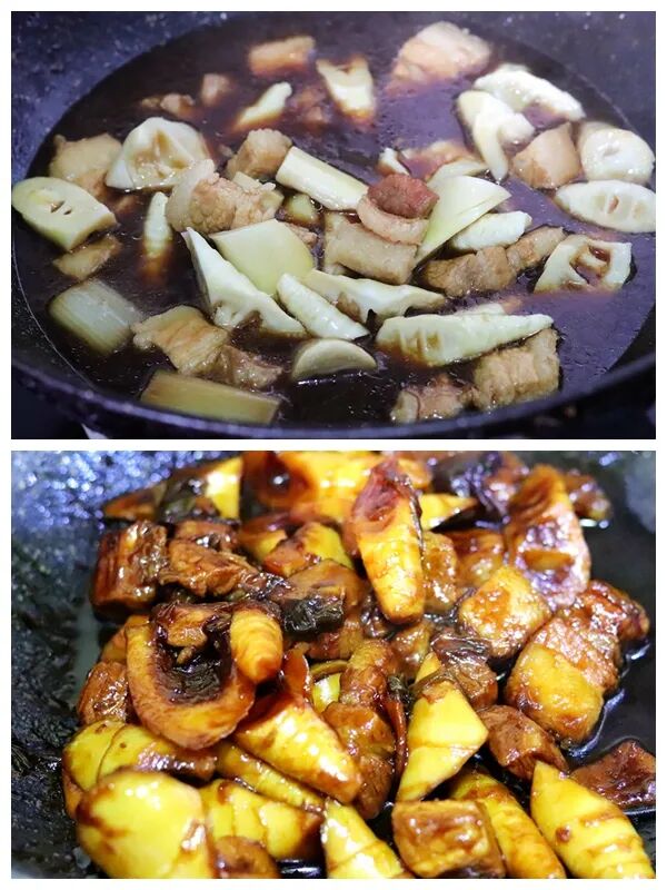 3、五花肉焖煮好后,把春笋倒入锅中,再继续盖上锅盖,焖煮20分钟,然后开盖调大火收汁至浓稠状,就可以出锅装盘了!