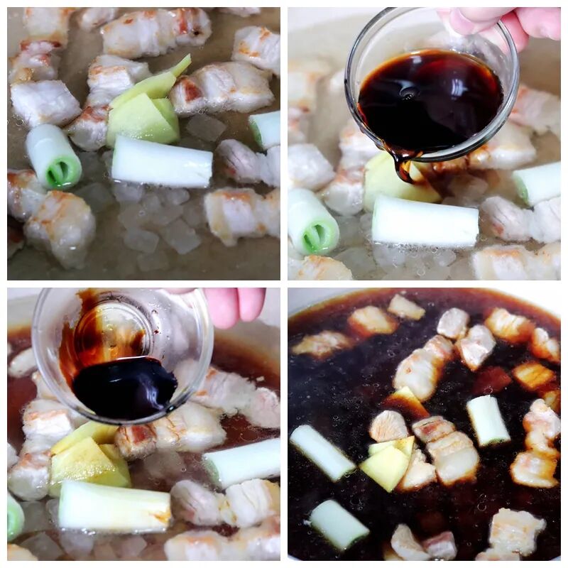 2、再翻入葱姜、料酒、生抽、老抽。开大火煮开,如果有浮沫,就用锅铲或者滤网撇去,然后盖上锅盖,调小火炖煮20分钟。