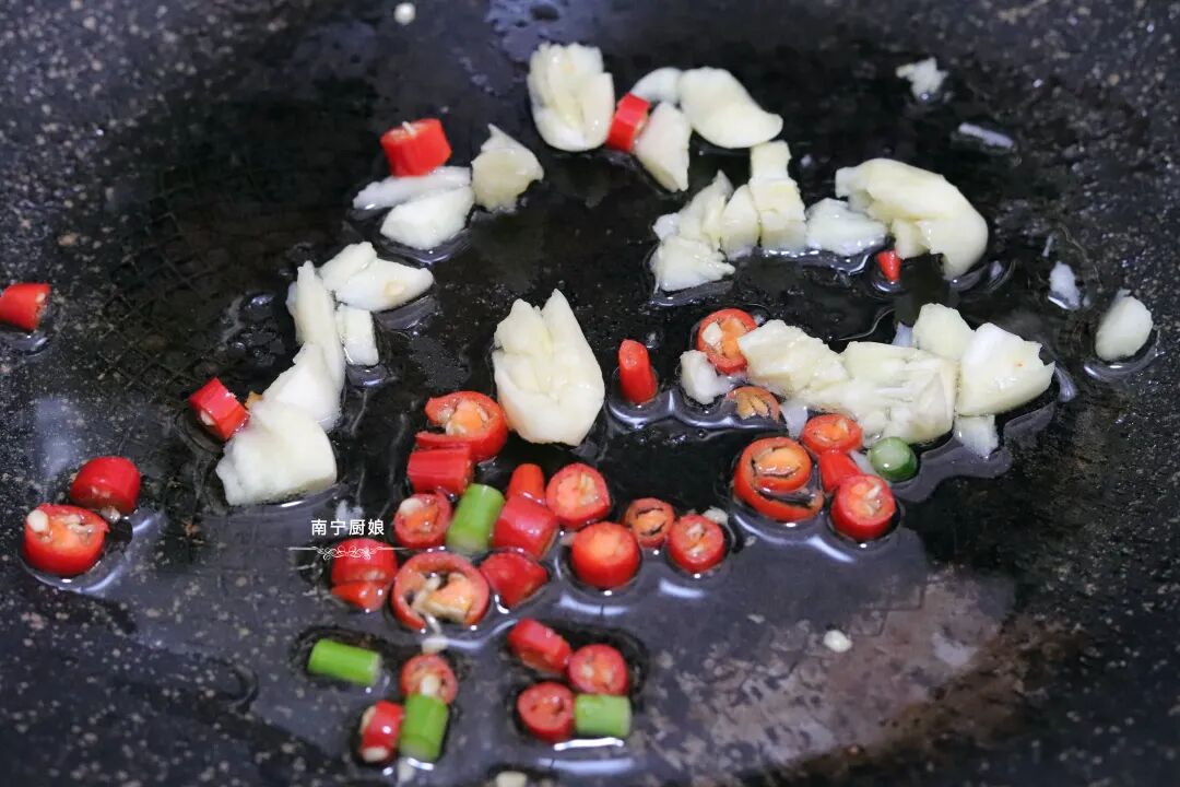1、起锅,在锅里倒入适量的油,小火烧热,把蒜米和小红椒爆香。