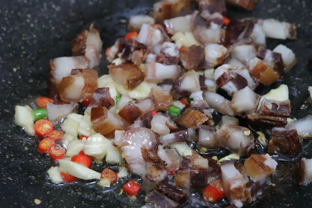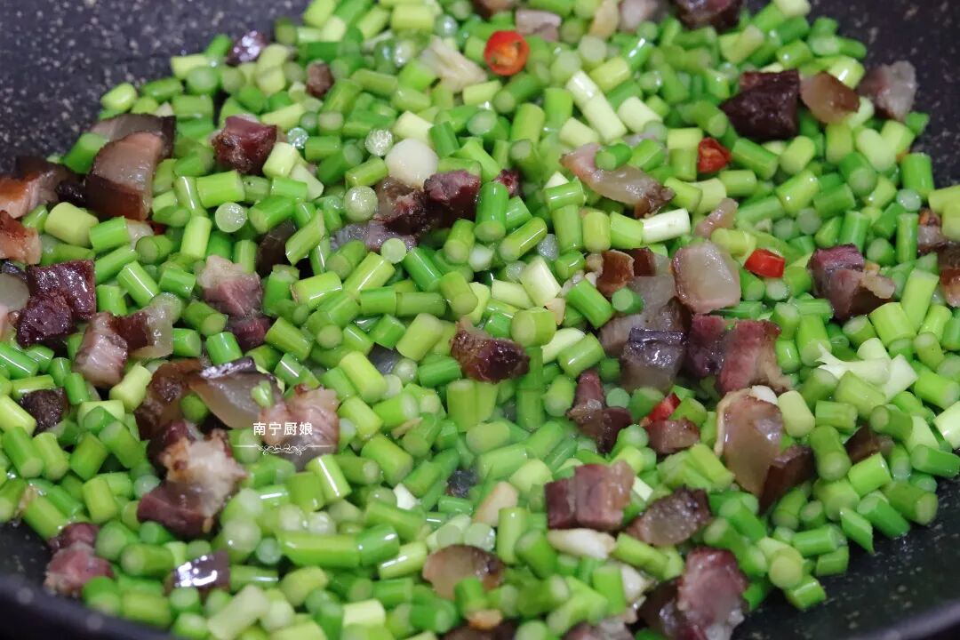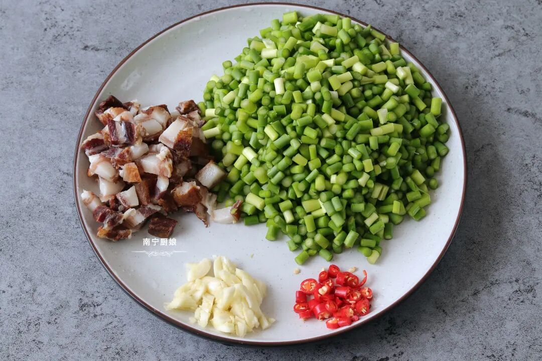 腊肉用温水清洗干净后切丁(因为我们家的腊肉是自己烘烤的,有烟灰在上面,所以需要用温水清洗下表面的烟灰)、蒜薹切掉两头,取中间部位切碎,蒜米去皮后切碎,小红椒洗净后切碎。