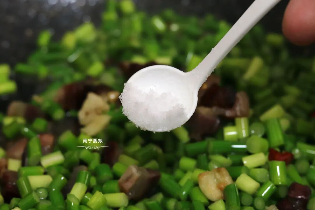 4、蒜薹炒软炒熟后,放入小半勺生抽和一小勺食盐调味,翻炒均匀,即可出锅。