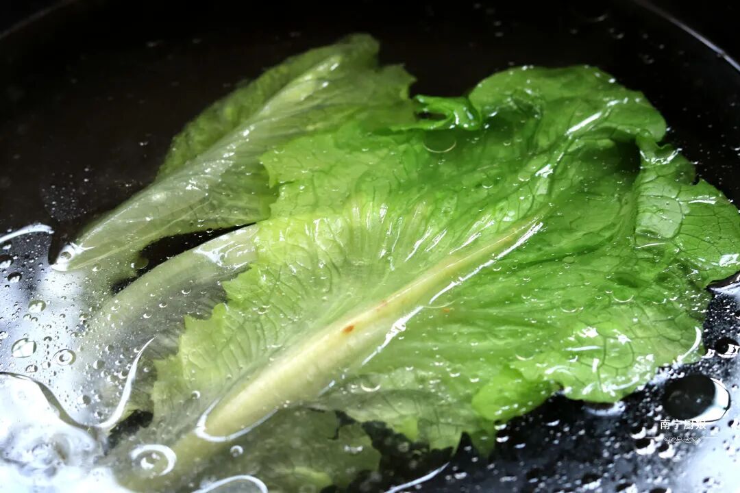 3、水烧沸后,把生菜依次放入热水中烫上3秒钟,不要太久哦,免得枯掉了