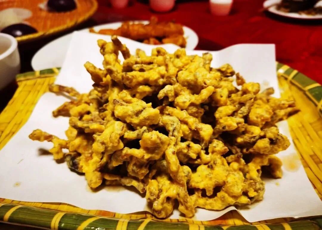 7.将油温再次加热,然后倒入刚刚备用的茶树菇,进行复炸。炸至茶树菇表面面糊变脆后即可捞出备用。