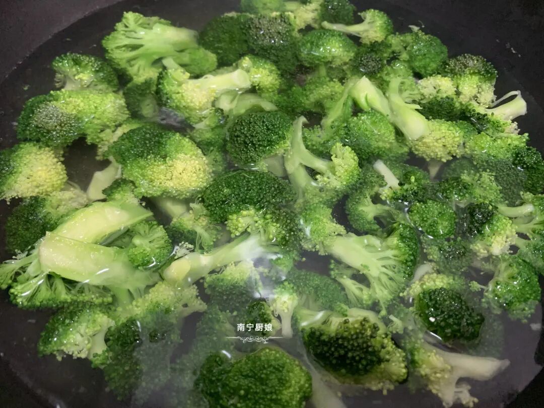 4、起锅,倒入半锅水烧沸,把西兰花放进去焯水一分半后捞出,在水龙头下冲洗后沥干待用。