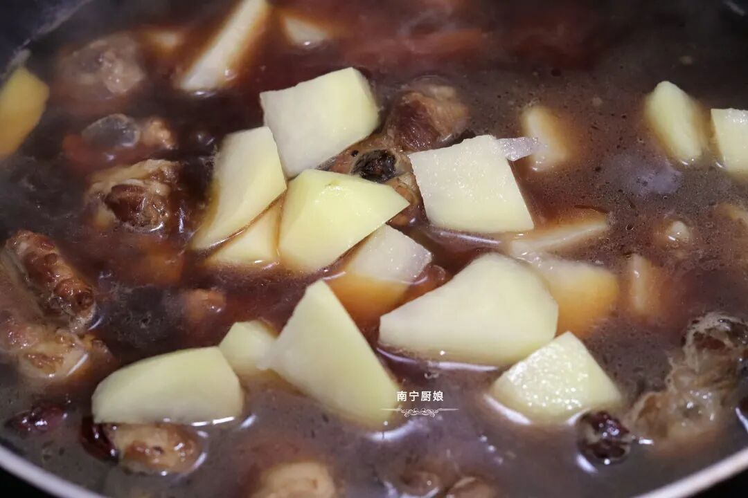 7、再倒入生抽、老抽、清水、土豆一起烧煮。