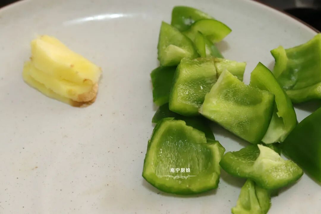 2、圆青椒洗净后切块,生姜去皮后切块。