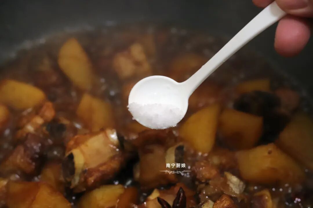 8、待锅中汤汁烧至快见底时,放入一勺食盐调味。