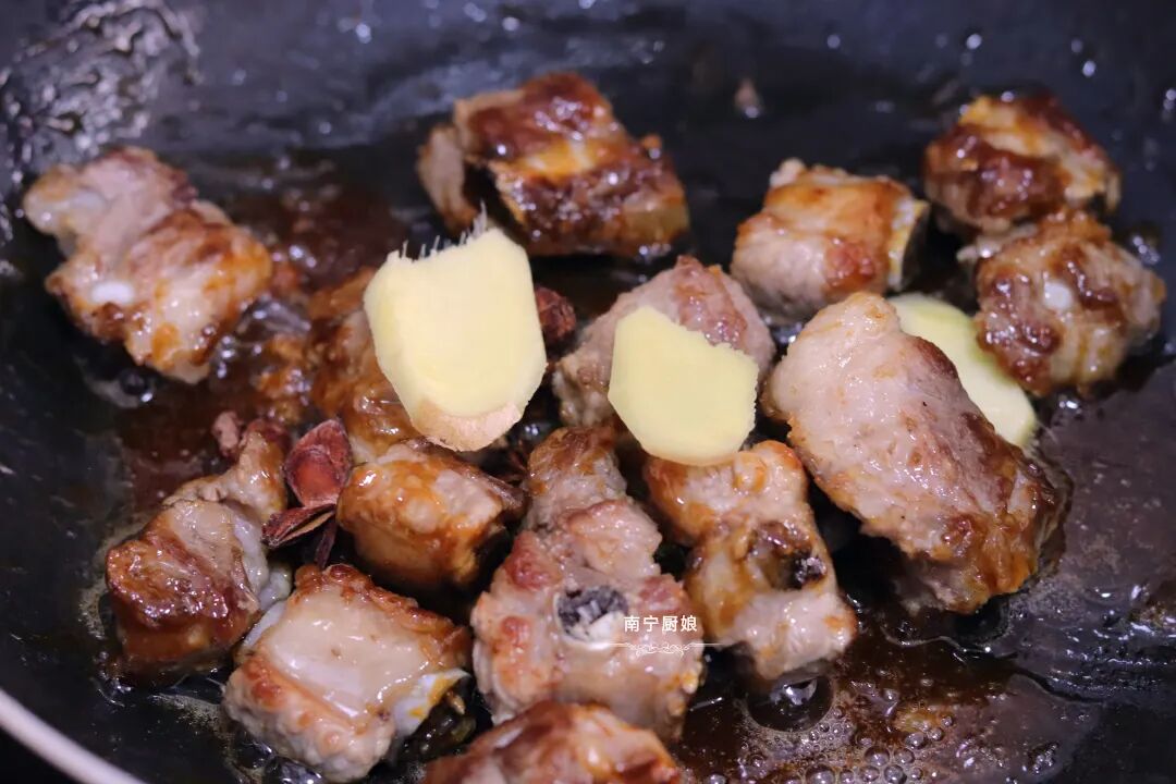 6、把排骨和糖色翻炒均匀,让排骨均匀的裹上糖色,再放入生姜一起翻炒均匀。