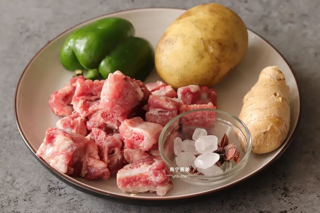 准备好食材:排骨1根砍成段、土豆一个、圆青红椒各1个、生姜2片、冰糖8颗、料酒一勺、八角1颗、食盐1勺、生抽1勺、老抽半勺。