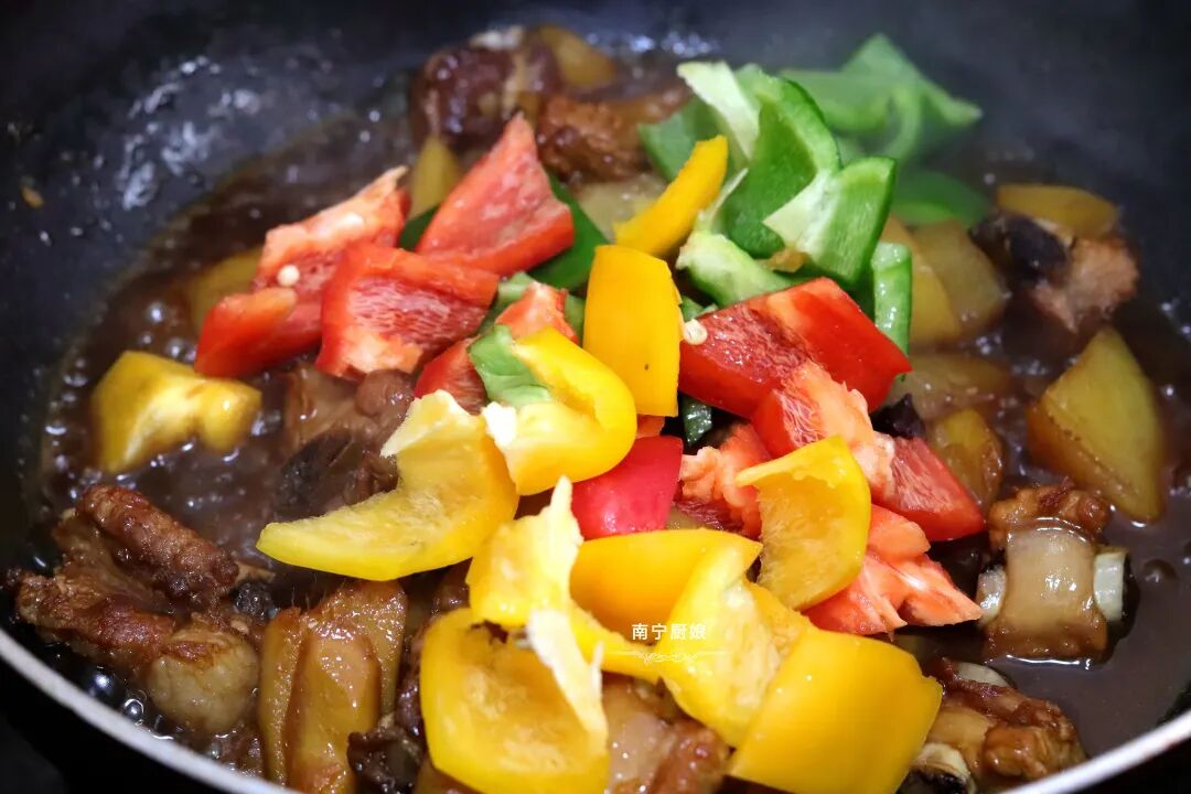 9、出锅之前再把青红椒块倒入,一起翻炒均匀即可出锅。