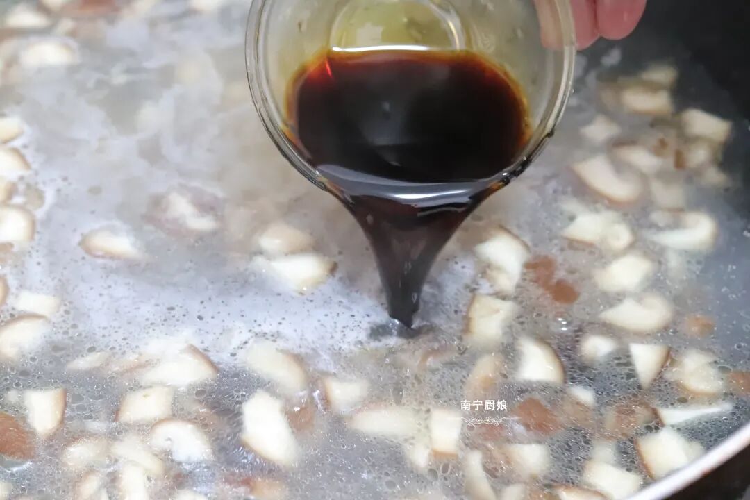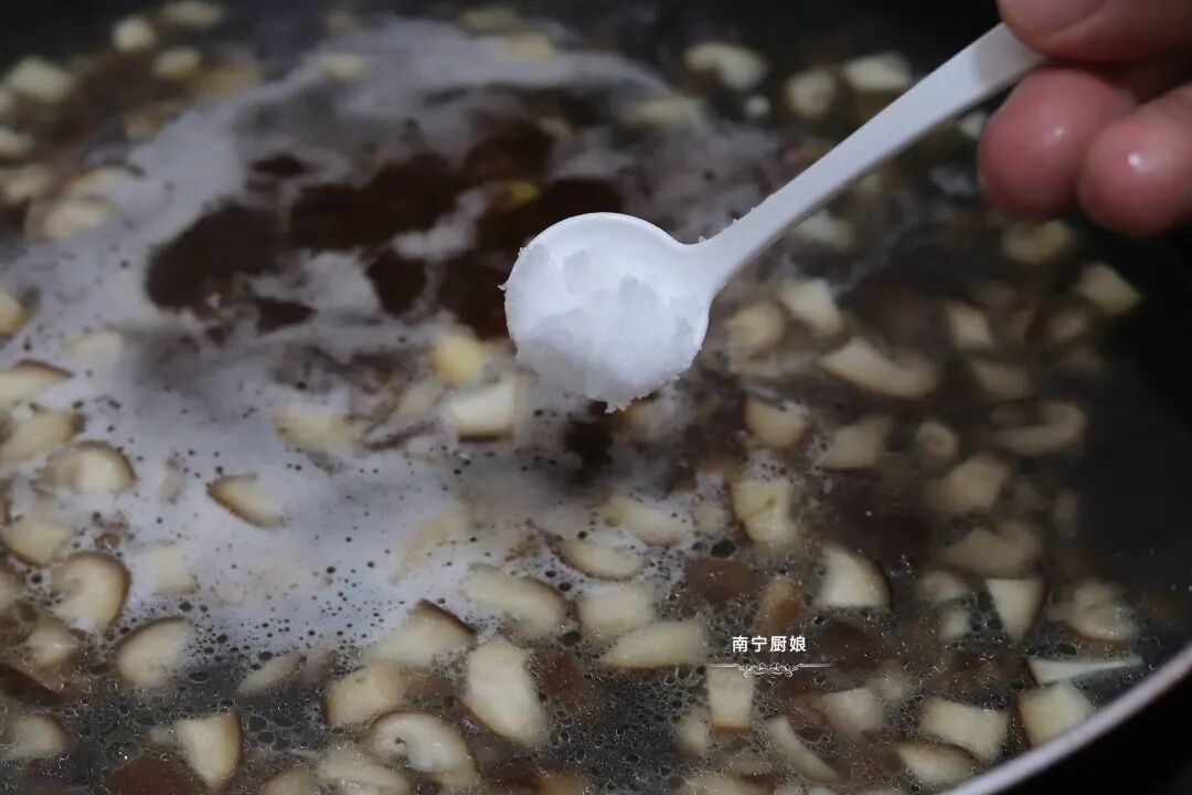 5、放入一勺生抽和一勺食盐调味调色。