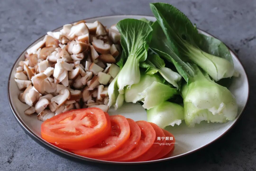 1、把香菇洗净后切碎,番茄洗净后切片,小白菜洗净后切掉根部掰成小片待用。