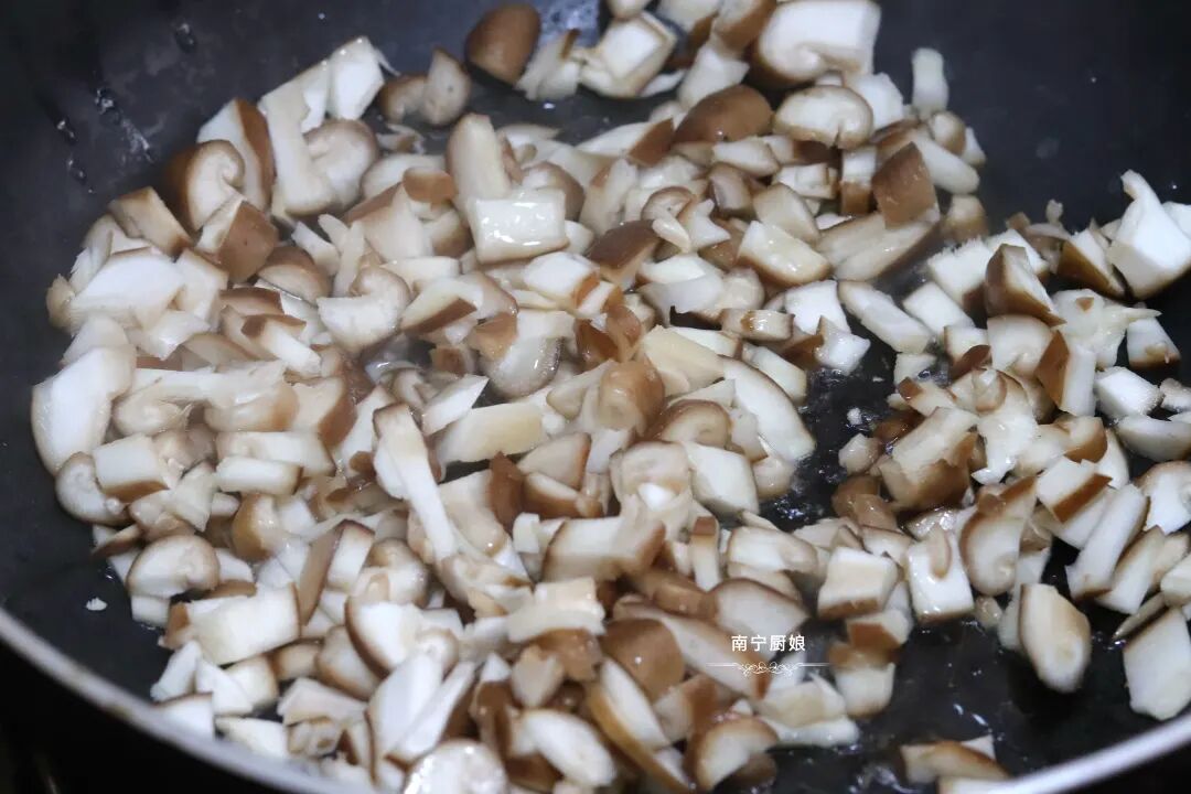 3、重起锅,在锅里倒入适量的油小火烧热,把香菇碎倒入炒香。