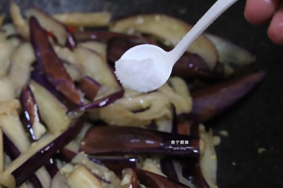 5、出锅之前再放入一小勺食盐即可,不用放太多,因为前面有用食盐腌制过茄条,茄子已经吸收了些许食盐了。