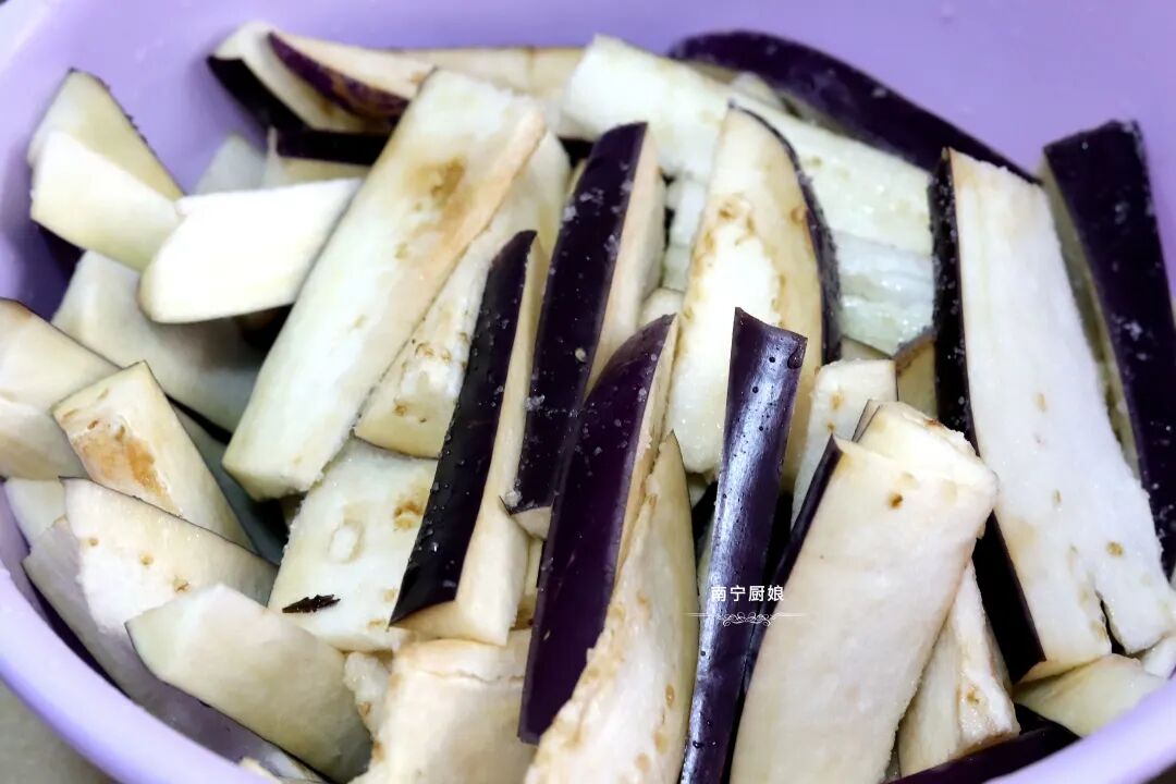 1、把茄子清洗干净后切成等长的茄条,然后装进大碗或者大盆里,撒入一勺食盐搅拌均匀,让茄条腌制10分钟,让茄条脱水,时间到之后,再用双手把茄条挤干水分沥干待用。