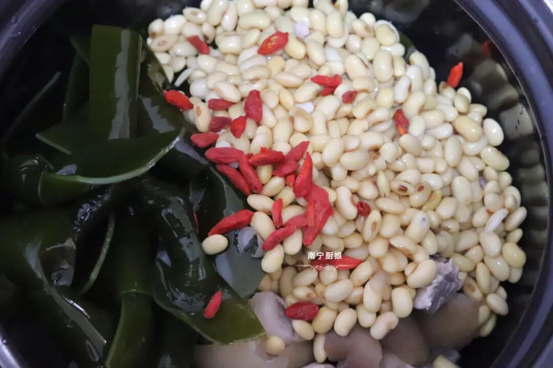 3、把海带结和泡发好的黄豆、枸杞放进去(黄豆提前一个晚上泡好)