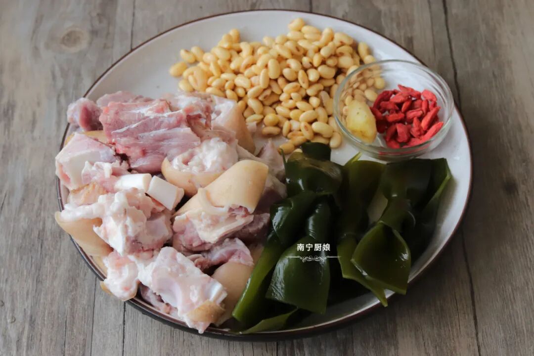 准备好食材:猪蹄半只、海带结6条、黄豆150克、枸杞10克、生姜1片、食盐1勺。