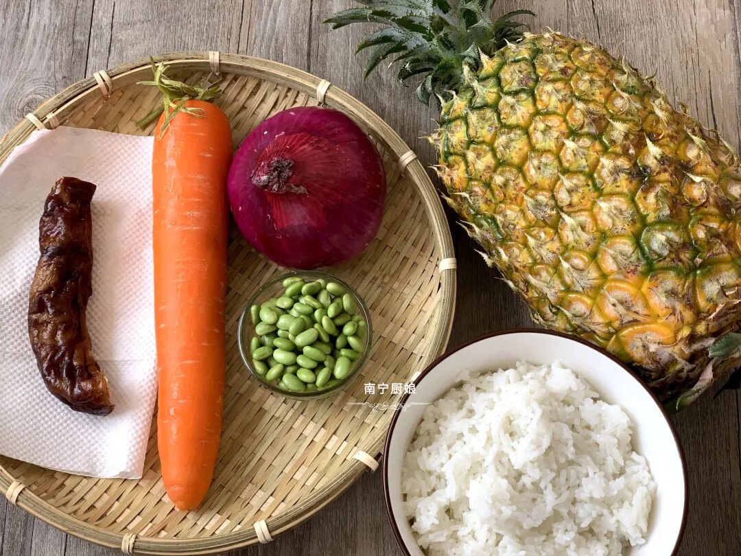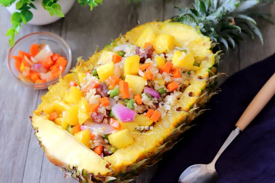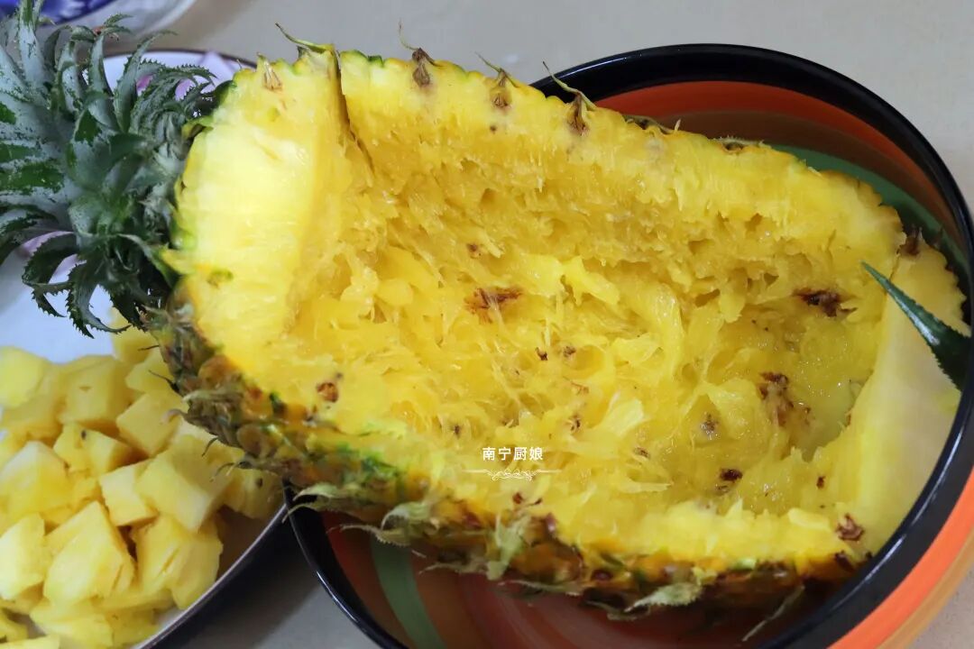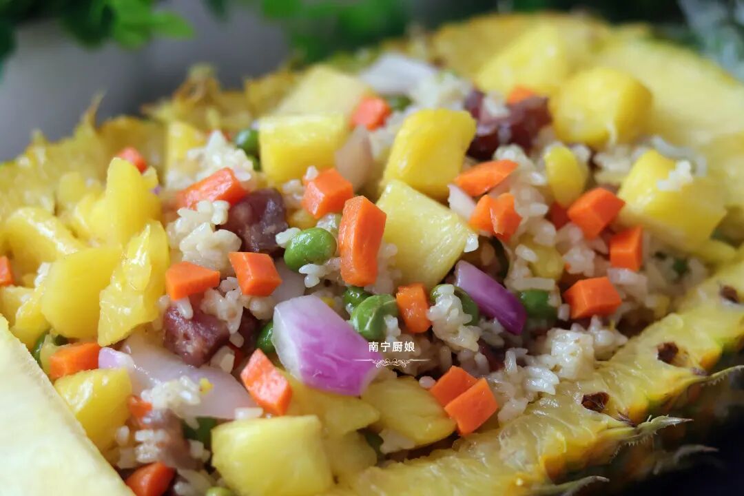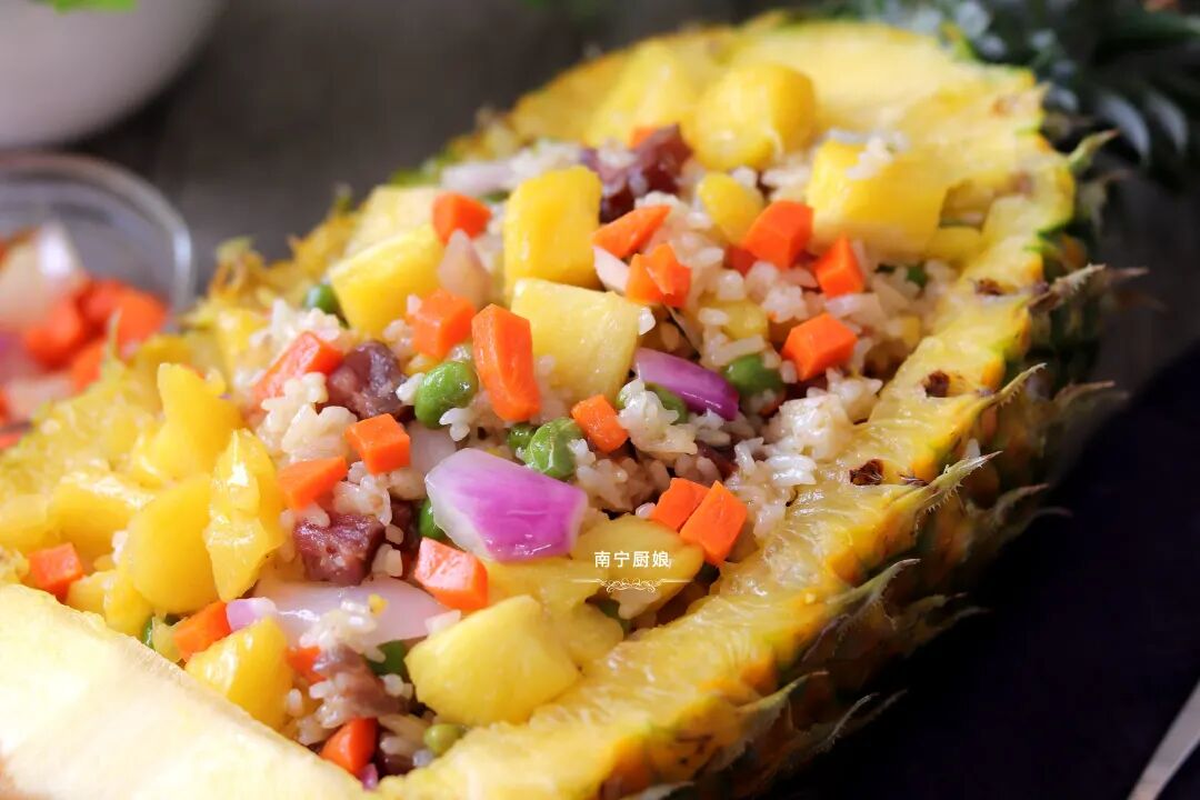 菠萝除了去皮去刺用盐水浸泡着生吃之外,也可以加热烹调成菜肴依然很美味,像菠萝鸭和菠萝咕老肉、菠萝炒饭等超人气美食就是代表之一。今天厨娘就和大家分享菠萝饭的家常做法。