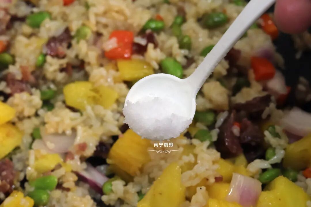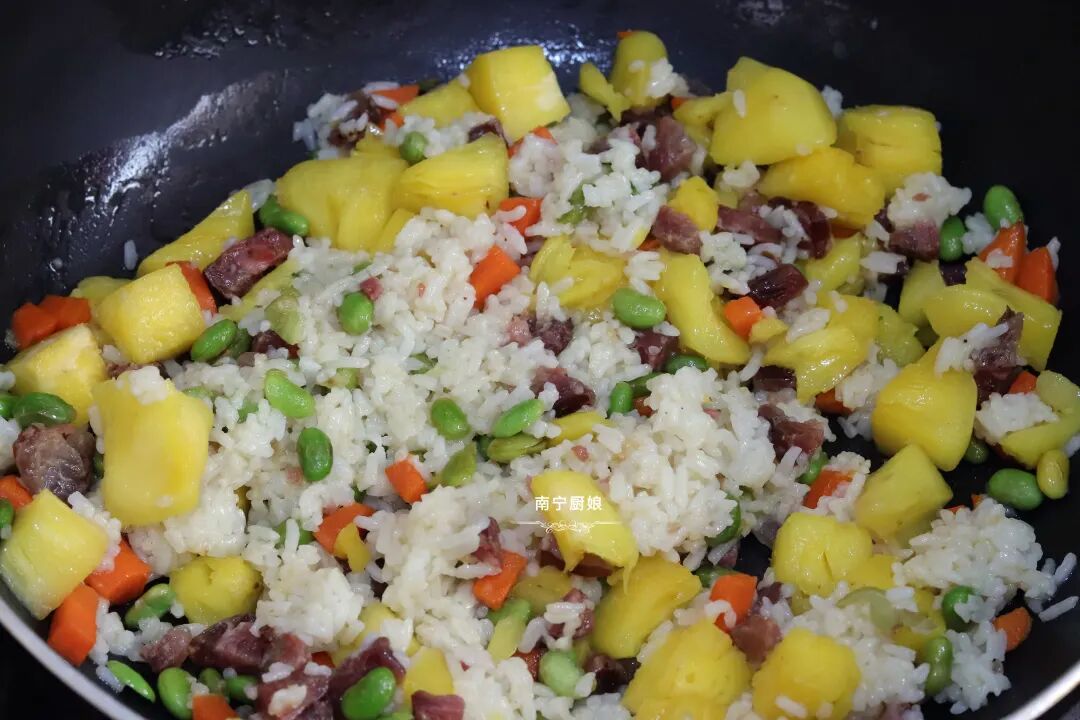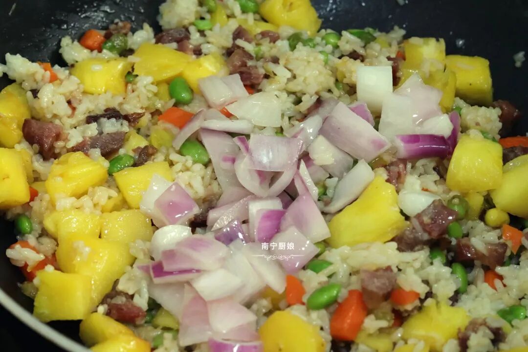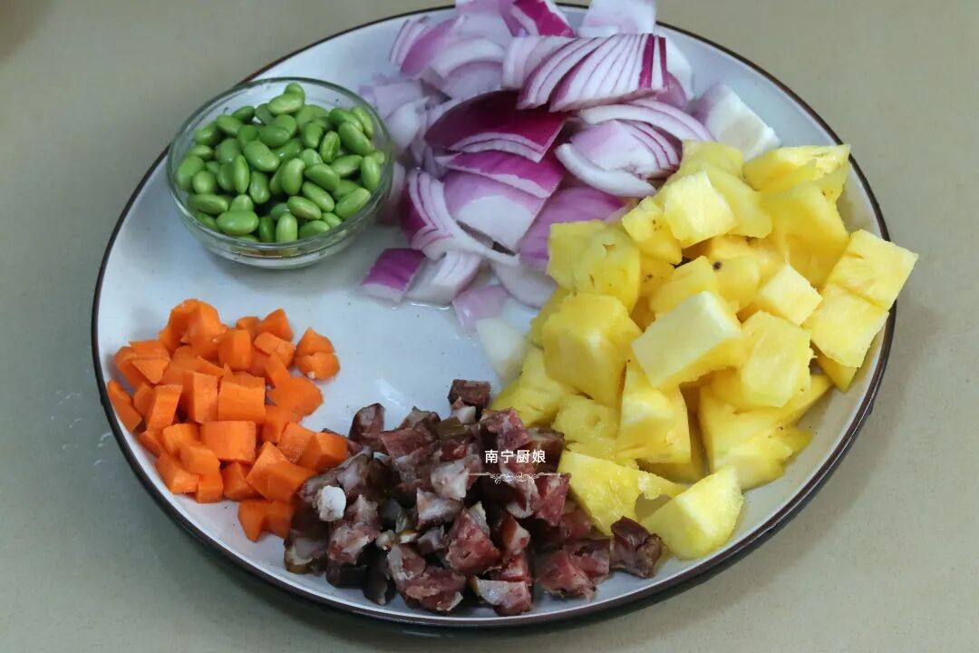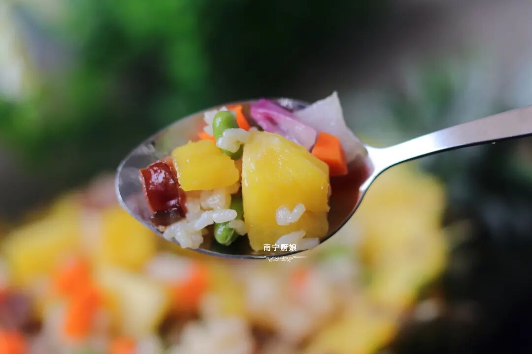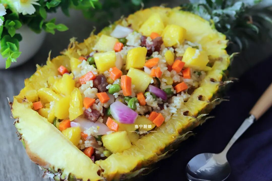 菠萝除了去皮去刺用盐水浸泡着生吃之外,也可以加热烹调成菜肴依然很美味,像菠萝鸭和菠萝咕老肉、菠萝炒饭等超人气美食就是代表之一。今天厨娘就和大家分享菠萝饭的家常做法。