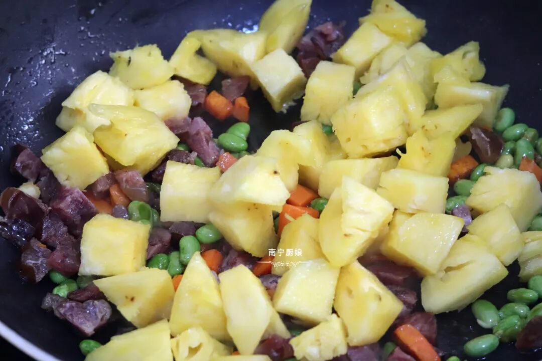 5、再倒入菠萝块一起翻炒。