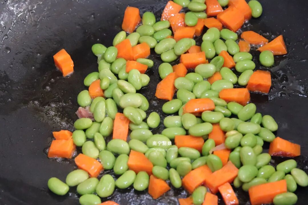 3、起锅,在锅里倒入适量的油,小火烧热,因为青豆和胡萝卜难熟,所以先把青豆和胡萝卜块倒进去翻炒1分钟。